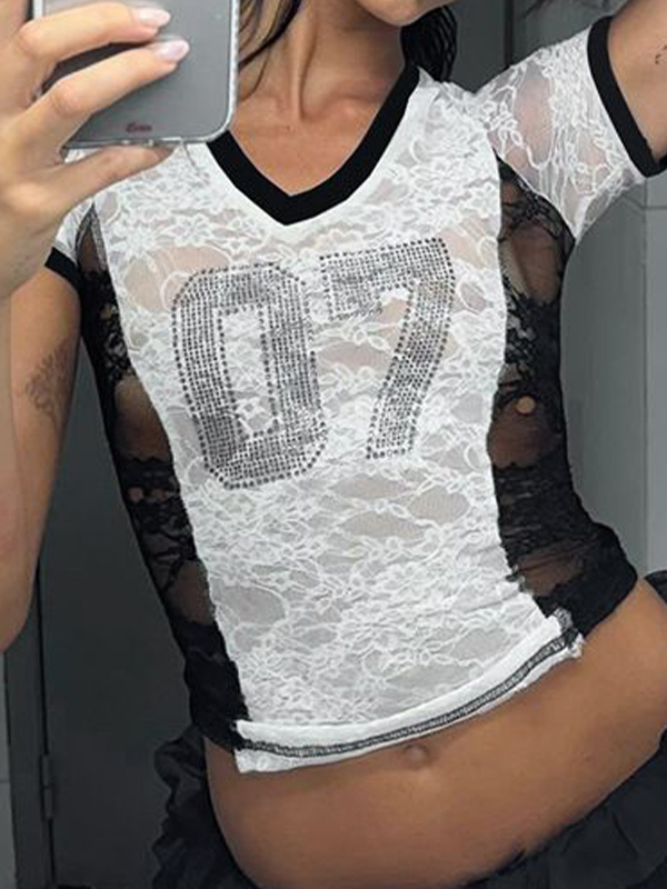 Kurzärmeliges T-Shirt mit Spitze und Monogramm