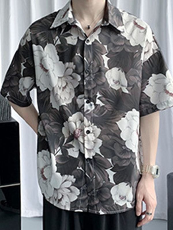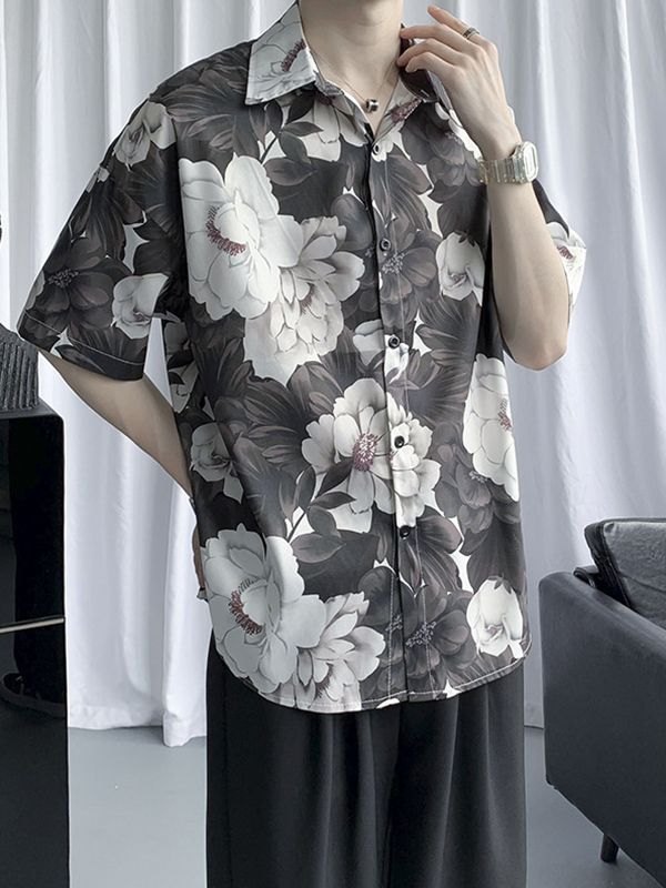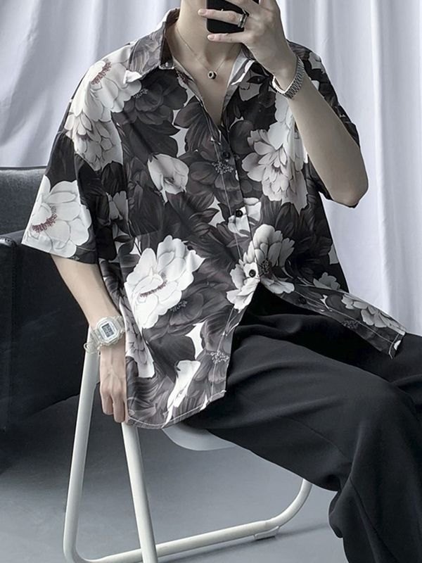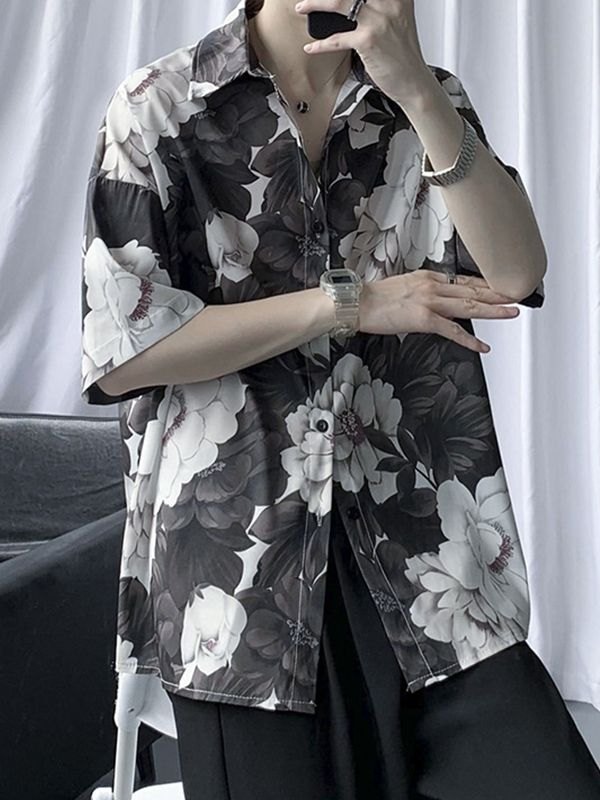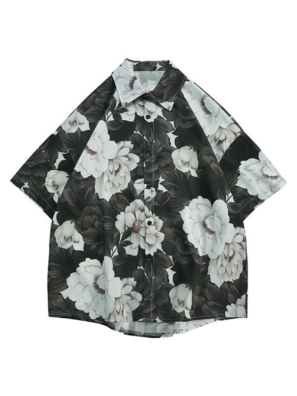 Stil: Casual/Street/Vintage Farbe: Schwarz Material: Polyester Passform: Normale Passform Ausschnitt: Umlegekragen Ärmellänge: Kurzarm Design: Dieses Hemd hat einen durchgehenden Blumendruck und eine schmeichelhafte Passform mit Knopfverschluss vorne.