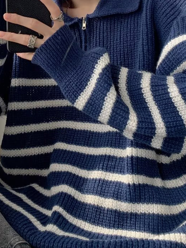 Gestreifter Herrenpullover mit halbem Reißverschluss und Reverskragen