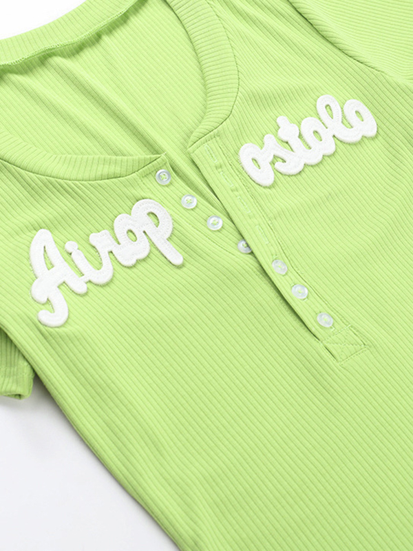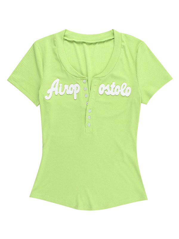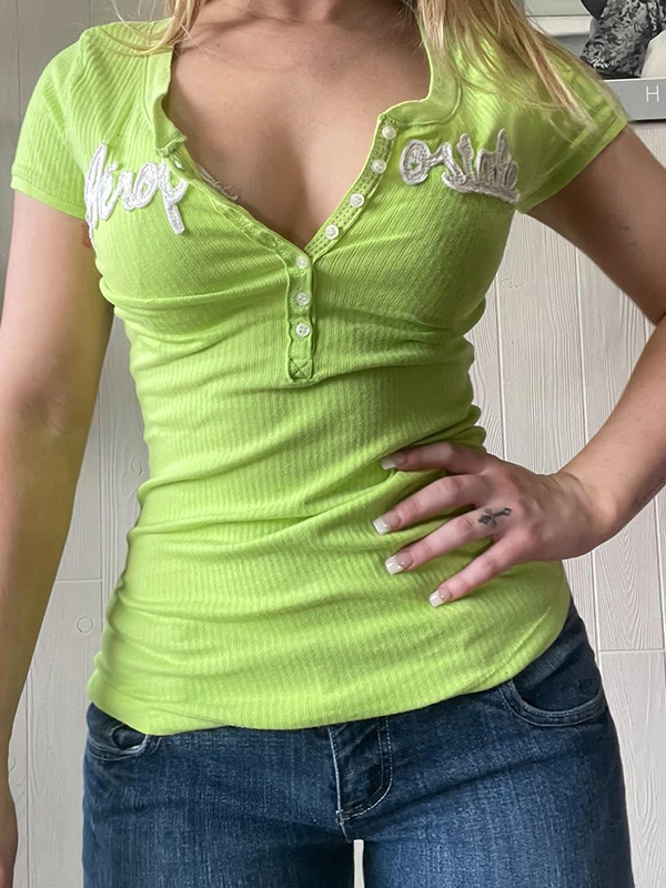 V-Ausschnitt, Buchstabendruck, kurzärmlige Strickwaren