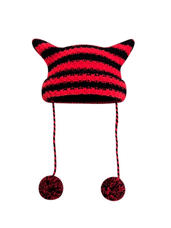 Beanie-Mütze mit Streifen-Katzen-Design und Vintage-Anhänger