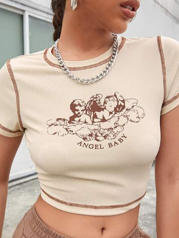 V-Ausschnitt, Buchstabendruck, kurzärmlige Strickwaren
