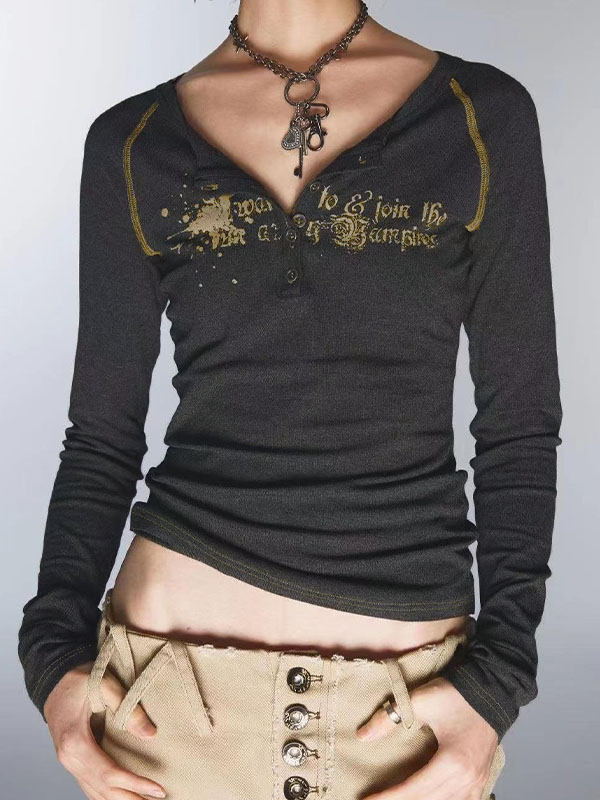 Langarm-T-Shirt mit V-Ausschnitt und Vintage-Print