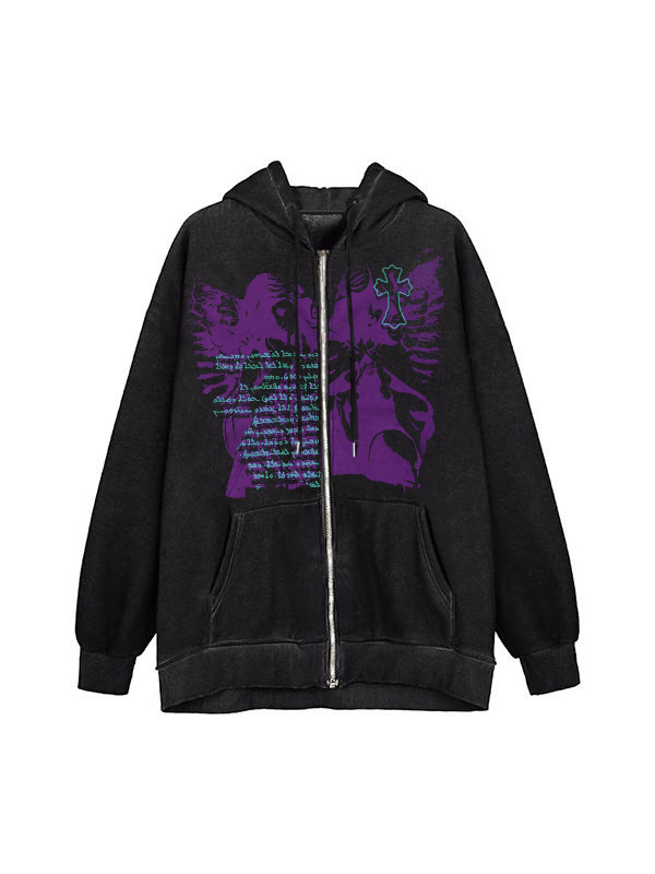 Übergroßer Kapuzenpullover mit Vintage-Kreuz-Grafikdruck und Reißverschluss